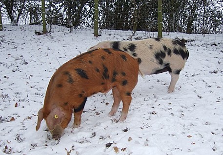 The pigs are naturally reared and free range and enjoy playing in the wood. The Oxford Sandy and Black pig was often known as the 'Oxford forest pig', the 'plum pudding pig'. They have excellent temperaments, are good foragers, hardy and make good mothers. Making them an excellent pig for the beginner and smallholder. They are sandy in colour ranging from dark rust to a light sandy colour with black blotches over their body. Ideally they should have a white blaze and white feet. The Oxford Sandy and Black Pig is a medium to large pig with good length and deep body with strong legs and feet.