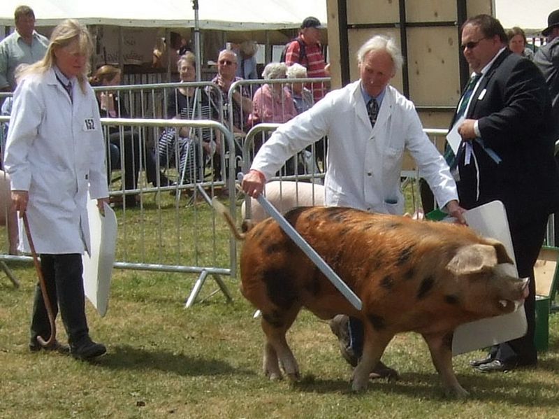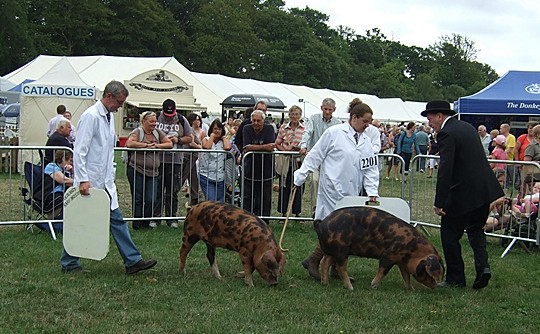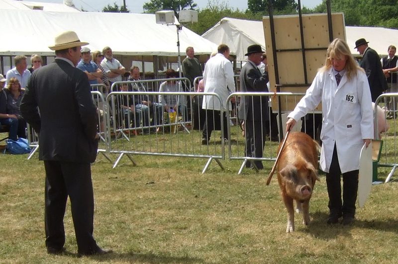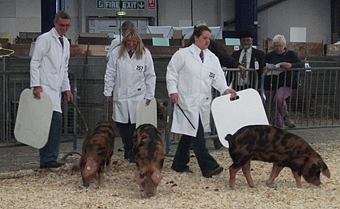 Inch and Emma showing Blossom and Petal at the New Forest Show 2010 where Petal came first in the January 2010 Born Gilts (her sister Blossom was 2nd) and Petal then went on to take the Reserve Champion Oxford Sandy and Black pig.