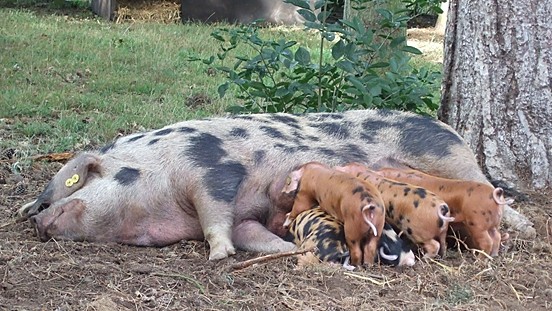 Below Clarris relaxing in the wood, feeding her last litter of Oxford Sandy and Black piglets